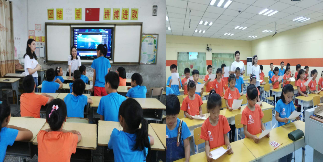 研究生蒯金娜、彭婷对4-5年级学生们进行了“信仰教育”教学,播放《厉害了我的国》相关片段,展开了关于梦想的讨论,以正能量的故事激励学生们的梦想。同时,姜兰、胡皓对1-3年级学生进行了先锋事迹宣讲,向学生们介绍了习近平总书记的先锋事迹,并针对什么是榜样、怎样学习榜样进行讨论。之后,研究生们组织大家进行关于中国少年先锋队知识的抢答,大家齐唱少年先锋队队歌。
