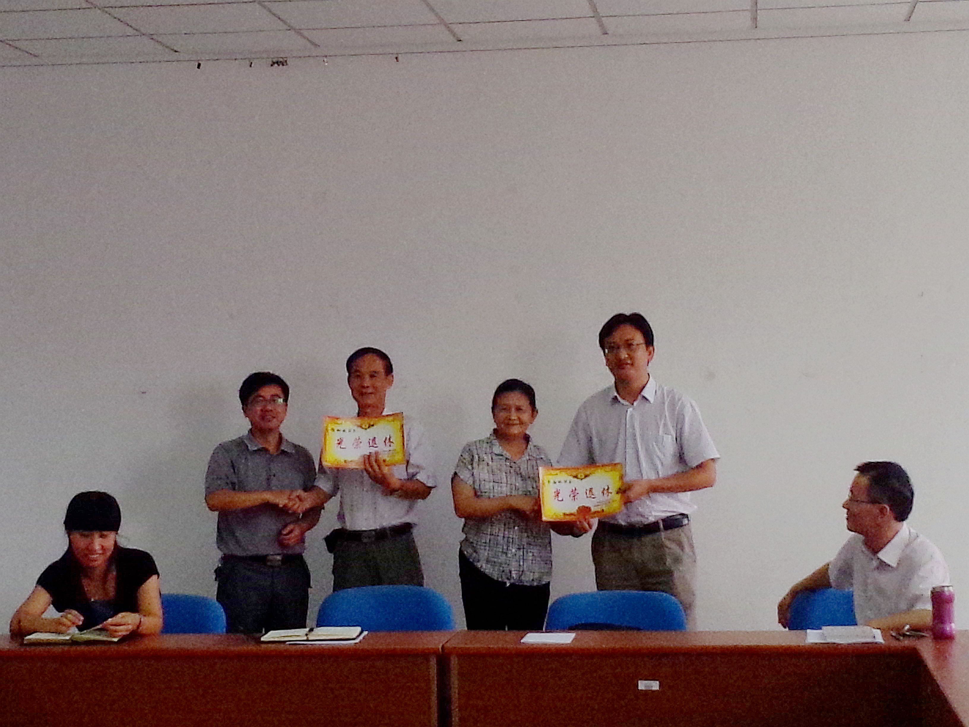 学院领导向谢树放教授、李国环副教授颁发“光荣退休证”
