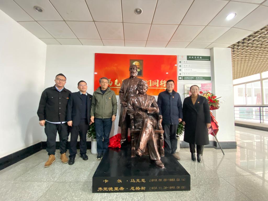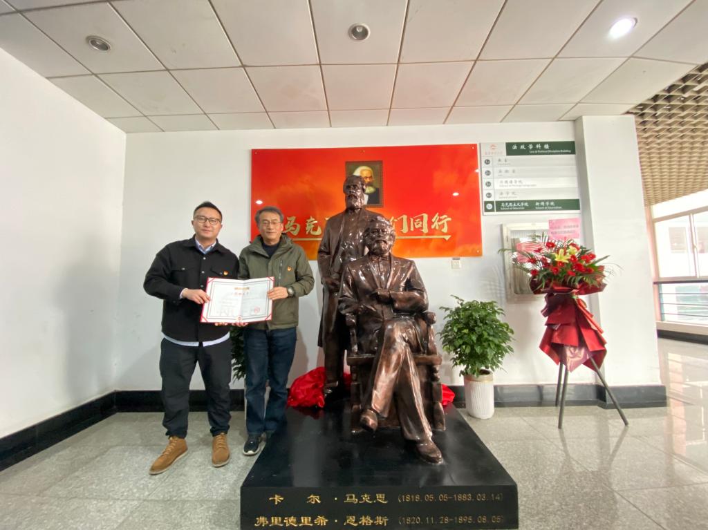 院长卓承芳共同为马克思恩格斯雕像揭幕。