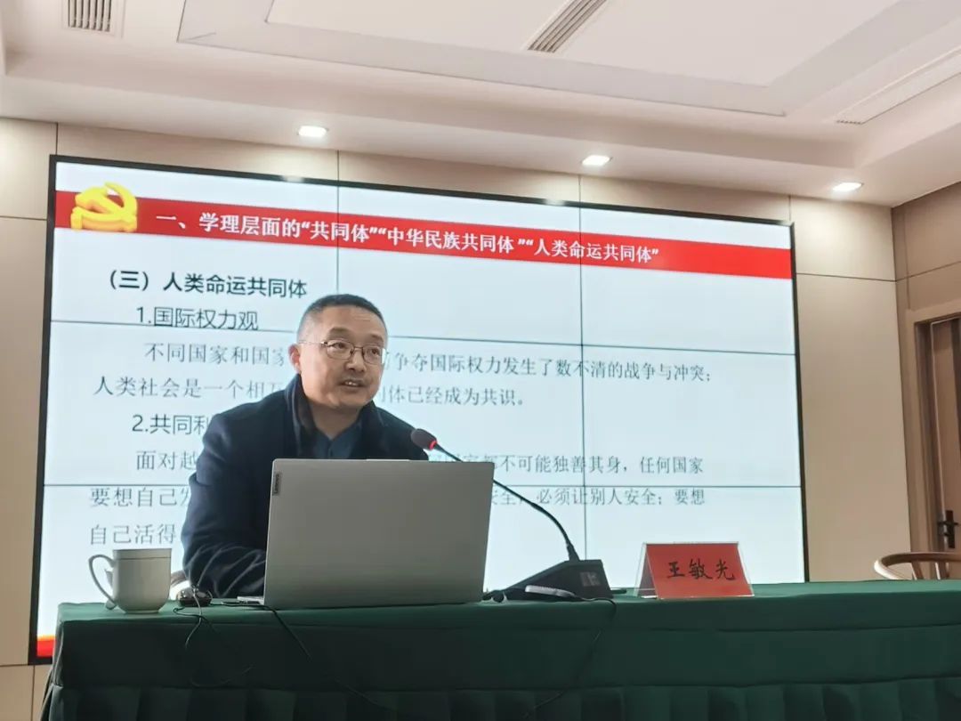 副院长、教授王敏光以“铸牢中华民族共同体意识”为主题进行了授课。王敏光在授课中指出,中华民族共同体意识是国家统一之基、民族团结之本、精神力量之魂,铸牢中华民族共同体意识是新时代党的民族工作的主线,要紧紧围绕铸牢中华民族共同体意识这条主线,扎实推进民族团结进步事业。