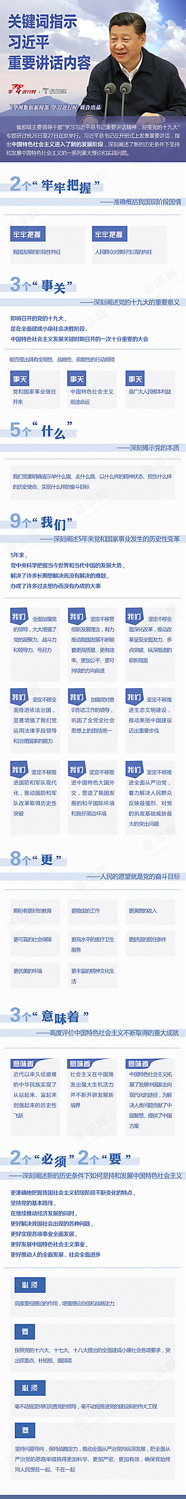 习近平强调,即将召开的党的十九大,是在全面建成小康社会决胜阶段、中国特色社会主义发展关键时期召开的一次十分重要的大会,能否提出具有全局性、战略性、前瞻性的行动纲领,事关党和国家事业继往开来,事关中国特色社会主义前途命运,事关最广大人民根本利益。我们党要明确宣示举什么旗、走什么路、以什么样的精神状态、担负什么样的历史使命、实现什么样的奋斗目标。