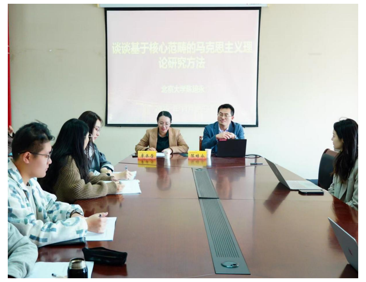 师生作题为“谈谈基于核心范畴的马克思主义理论研究方法”的学术讲座。本次讲座由卓承芳院长主持,部分青年教师及2025级全体研究生参与学习。