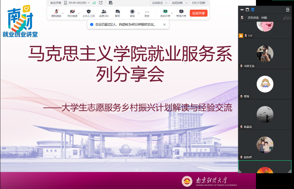 依托“南财就业创业讲堂”,线上举办就业服务系列分享会,聚焦大学生志愿服务乡村振兴计划,为学子解读基层就业政策与报考路径。